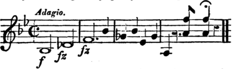 Our observations relative to Fugues, &c. may be exemplified in reference to the second part of the first Allegro of HAYDN’S 4th Sinfonia, where the subject is admirably fugued. The same treatment may he found in the last movement of HAYDN’S No. 5 in C. minor. The Pianoforte accompaniment to the last few bars of the above Sinfonia in B flat produces a brilliant and pleasing effect, and was correctly played by the Conductor. BEETHOVEN’S Overture, “Leonora,” differs in style from all his others. The dramatic character throughout is highly illustrative of the Poem. The Trumpet Solo (which is played behind the scenes in the Theatre) is succeeded by a few bars so truly à la BEETHOVEN, and so precious of itself, that, whatever excess his imagination may occasionally lead to, such morceaux fully compensate the patient admirer, and are paramount to every possible objection. The effect of the basses moving in unison in the Adagio, and descending a fifth from F, and the chord becoming full pianissimo, is such as many fail to imitate with the employment of less simple means. There are passages for the flute and violins not very comfortably situated for either instrument, yet were performed in a masterly manner.