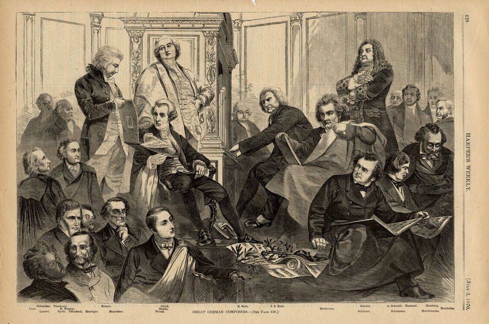 (from The British Library)Group portrait from Illustration from Harper’s Weekly, July 2, 1870, p. 428 of Franz Liszt, Friedrich Schneider, Joseph Lanner, Johann Gottlieb Naumann, Richard Wagner, Louis Spohr, Jacques Offenbach, Carl Gottlieb Reissiger, Wolfgang Amadeus Mozart, Giacomo Meyerbeer, Carl Maria von Weber, Joseph Haydn, Christoph Willibald Ritter von Gluck, Carl Phillip Emanuel Bach, Johann Sebastian Bach, Ludwig van Beethoven, Franz Schubert, Georg Frideric Handel, Johann Adam Schmidt, Robert Schumann, Johann Nepomuk Hummel, Bartholdy Felix Mendelssohn, Bernard Romberg, and Ignaz Moscheles (from King Library Digital Collections)